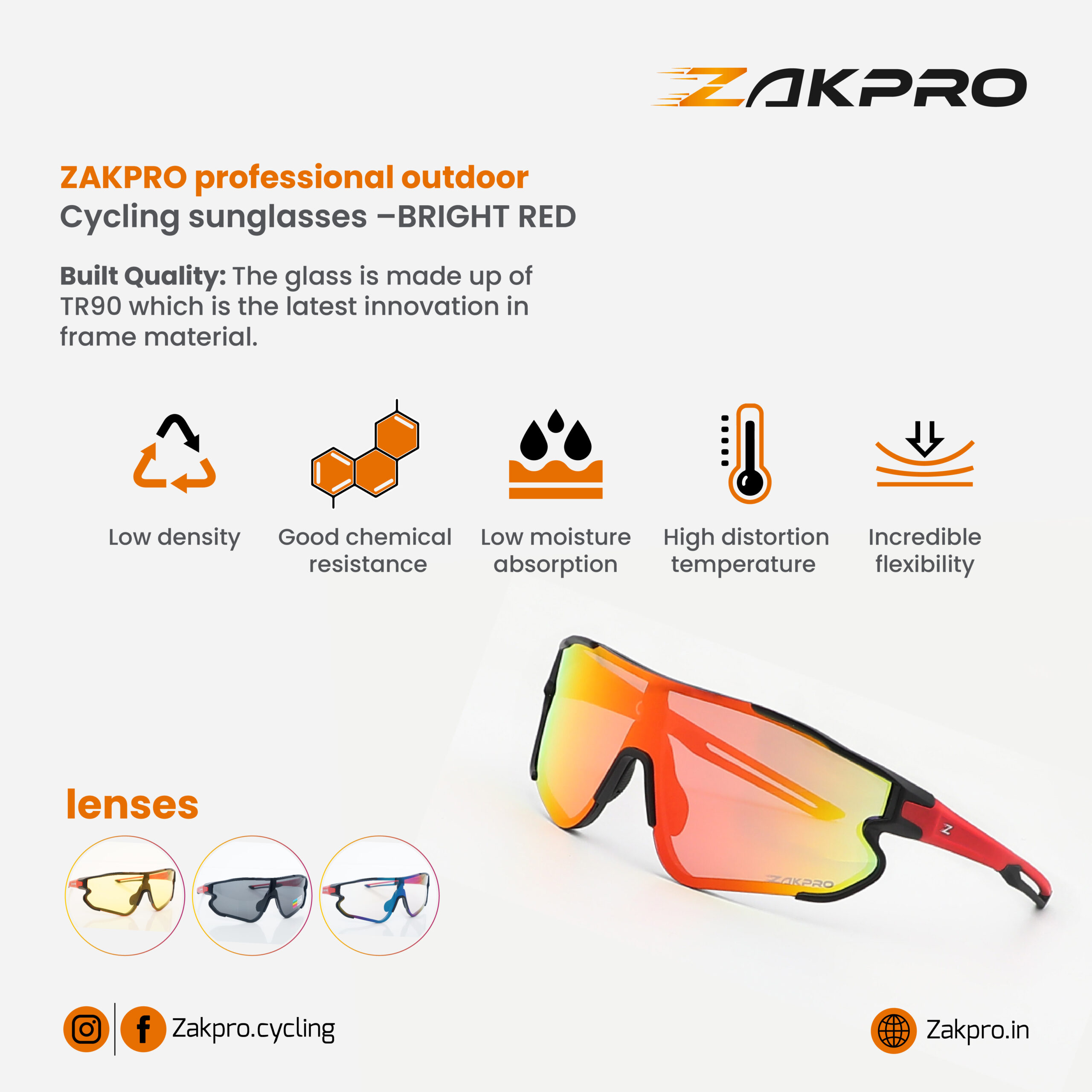 The ZAKPRO Professional Outdoor Sports Cycling Sunglasses (Bright Red) are composed of TR90 material. TR90 possesses features such as low density, good chemical resistance, low moisture absorption, high distortion temperature and flexibility, making the product comfortable and lightweight for cyclists. Based on the rider’s preference, ZAKPRO offers a variety of lenses. The grey polarized lens with anti-ultraviolet and anti-glare properties is long-lasting and offers UV400 protection. The REVO colourful lens, which is more fitting for outdoor sports acts as a shield against UV and infrared rays. The yellow lens is a night vision lens capable of enhancing vision clarity by increasing contrast in dim-lit conditions like twilight. The transparent lens is ideal for rainy weather. The myopia frame, which can be attached to the rider’s existing glasses is a special provision by ZAKPRO for riders who wear prescription lenses. Unparalleled in both performance and style, the ZAKPRO outdoor sports cycling sunglasses are the most reliable choice for cyclists.
